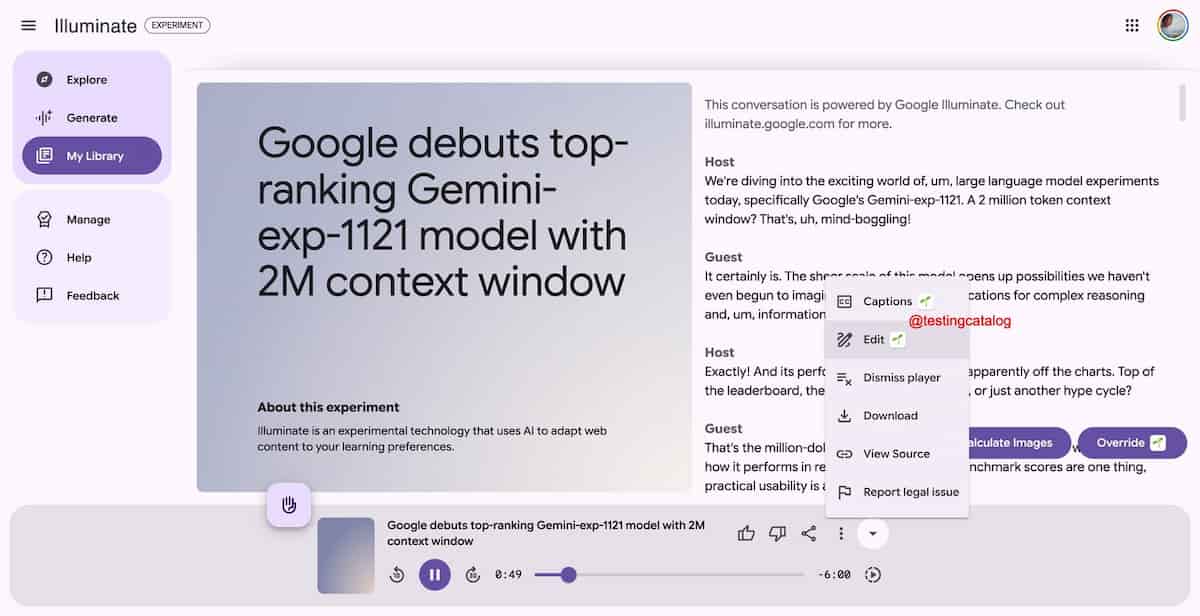 کنترلهای آزمایشی و نگاهی به آیندهای فراتر از صوت: ویرایش، زیرنویس و تولید تصویر علاوه بر این، کنترلهای آزمایشی دیگری مانند دکمه ویرایش، گزینههای فعال/غیرفعال کردن زیرنویس و حتی قابلیت تولید تصویر برای عکس روی جلد (کاور) نیز در رابط کاربری Illuminate مشاهده شده است، هرچند این موارد هنوز برای عموم کاربران قابل دسترس نیستند. این نشان میدهد که گوگل از ابتدا برنامههای گستردهتری برای این پروژه در سر داشته است.