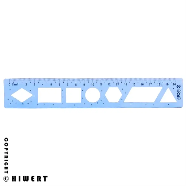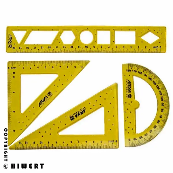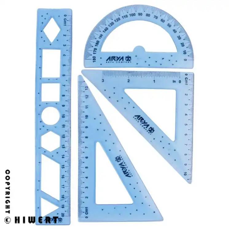 خط کش ۲۰ سانتیمتری: اندازهای ایدهآل برای دفتر و کتابهای استاندارد. (برخی مدلهای آریا در این ست دارای شابلون اشکال هندسی روی خط کش نیز هستند که کاربرد آن را دوچندان میکند).