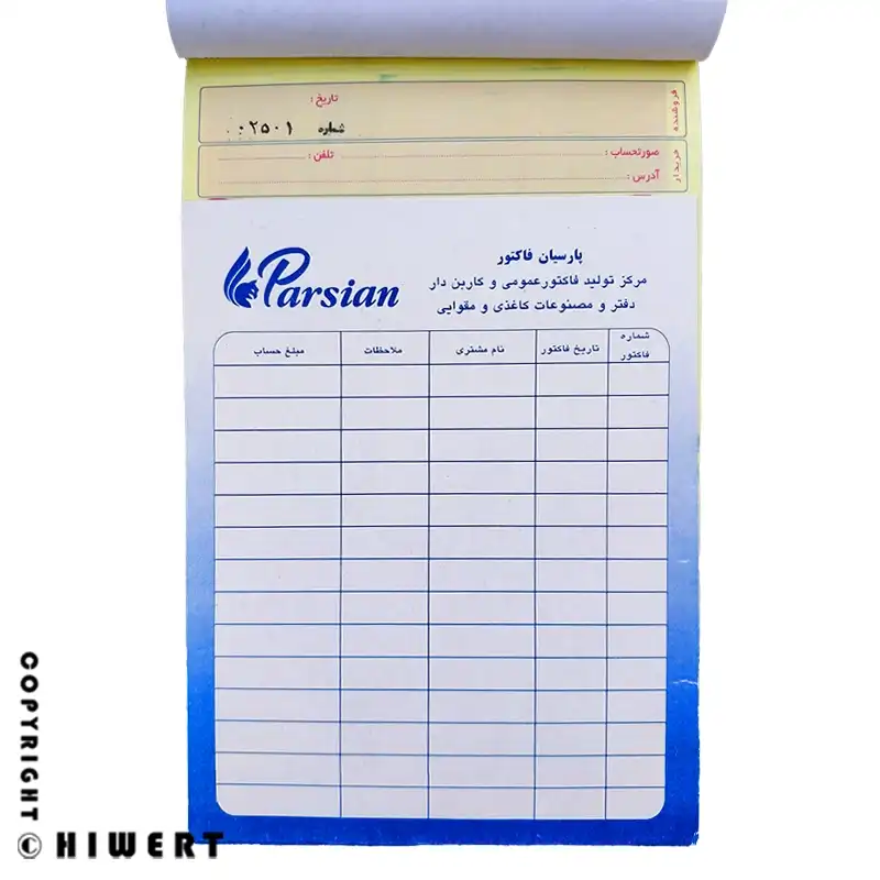 ۳. رنگ برگههای دوم چیست؟ در تولیدات استاندارد پارسیان، نسخه دوم معمولاً به رنگ زرد یا صورتی است تا تفاوت آن با نسخه اصلی (سفید) کاملاً مشخص باشد.