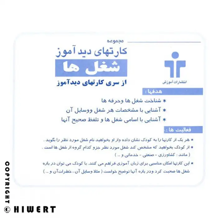 ۲. آیا شغلهای مدرن (مثل برنامه نویس) هم در آن هست؟ این مجموعه روی مشاغل پایه و ملموس که کودک در محیط اطراف میبیند (مثل معلم، نجار، خلبان) تمرکز دارد، زیرا درک این مشاغل برای سنین پایین راحتتر است.