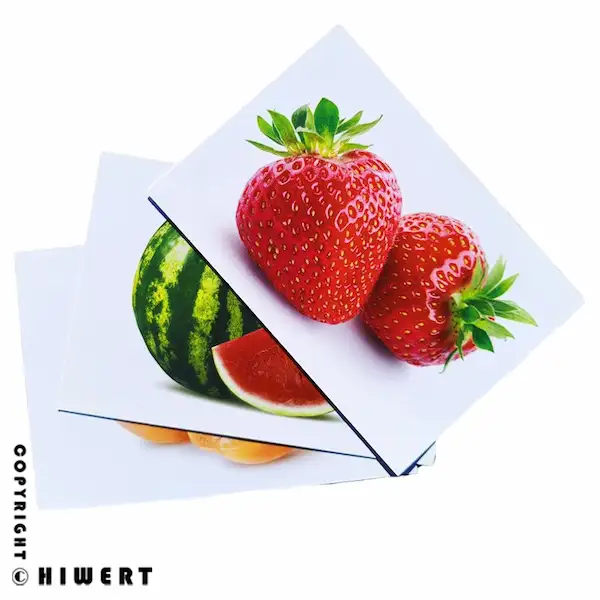 با توجه به اینکه نام انگلیسی میوهها (مثل Apple, Banana, Strawberry) روی کارتها نوشته شده، این محصول اولین قدم برای آموزش زبان دوم است.