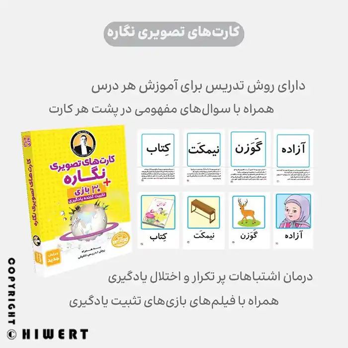 تصاویر این کارتها دقیقاً همان تصاویری است که کودک در کتاب فارسی مدرسهاش میبیند (امین، آزاده، بابا، نان و...).