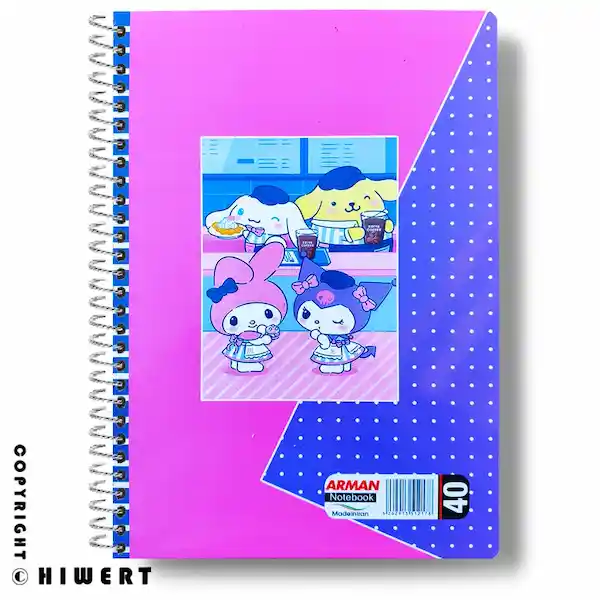 این دفتر ۴۰ برگ سیمی که با استانداردهای بالای برند "آرمان" تولید شده، فراتر از یک نوشت افزار معمولی است؛ جلد آن تصویری شاد و گروهی از کاراکترهای مشهور خانواده سانریو (Sanrio) شامل کرومی (Kuromi)، مای ملودی، سینامورول و پوم پوم پورین را به نمایش میگذارد که حس دوستی و نشاط را تداعی میکند.