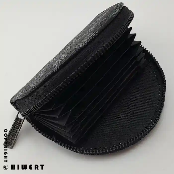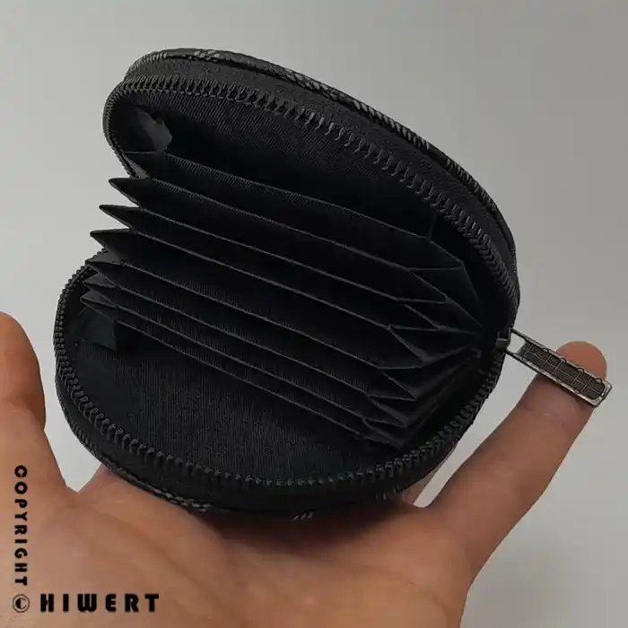 با باز کردن زیپ، با یک ساختار بادبزنی یا آکاردئونی روبهرو میشوید. این طراحی به شما اجازه میدهد تا تمام ۹ جای کارت را به صورت همزمان ببینید و بدون نیاز به بیرون کشیدن همه کارتها، مستقیماً کارت مورد نظرتان را بردارید.